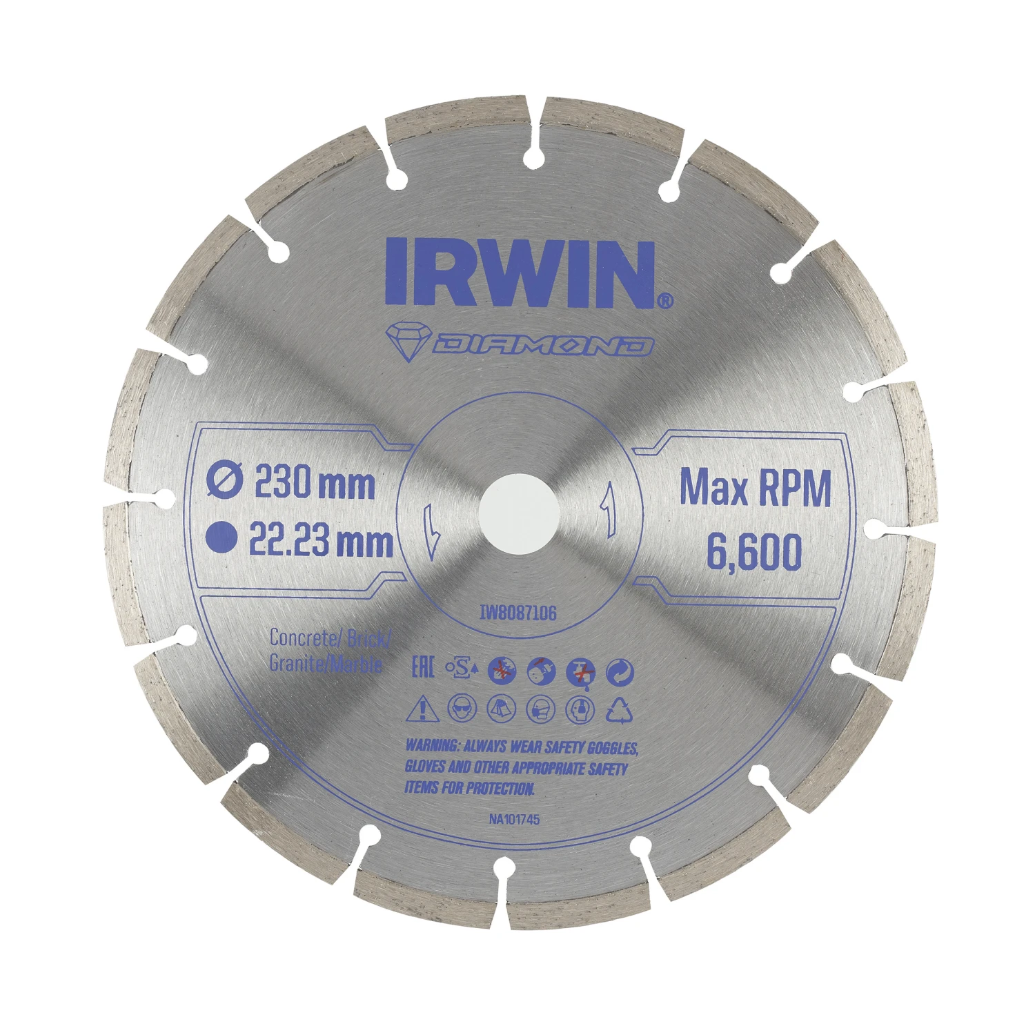 IRWIN Pro Performance diamantzaagblad IW8087106 past op alle gangbare 230mm haakse slijpers. Het zaagblad heeft een gesegmenteerde rand en is geschikt voor het doorslijpen van steen. Diameter diamantblad: 230mm.